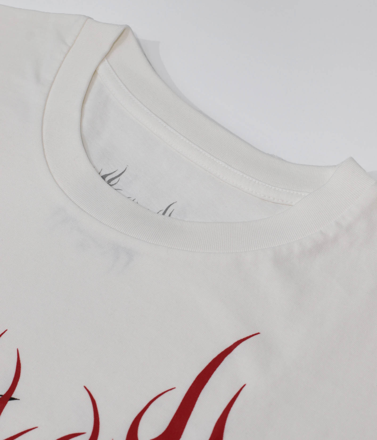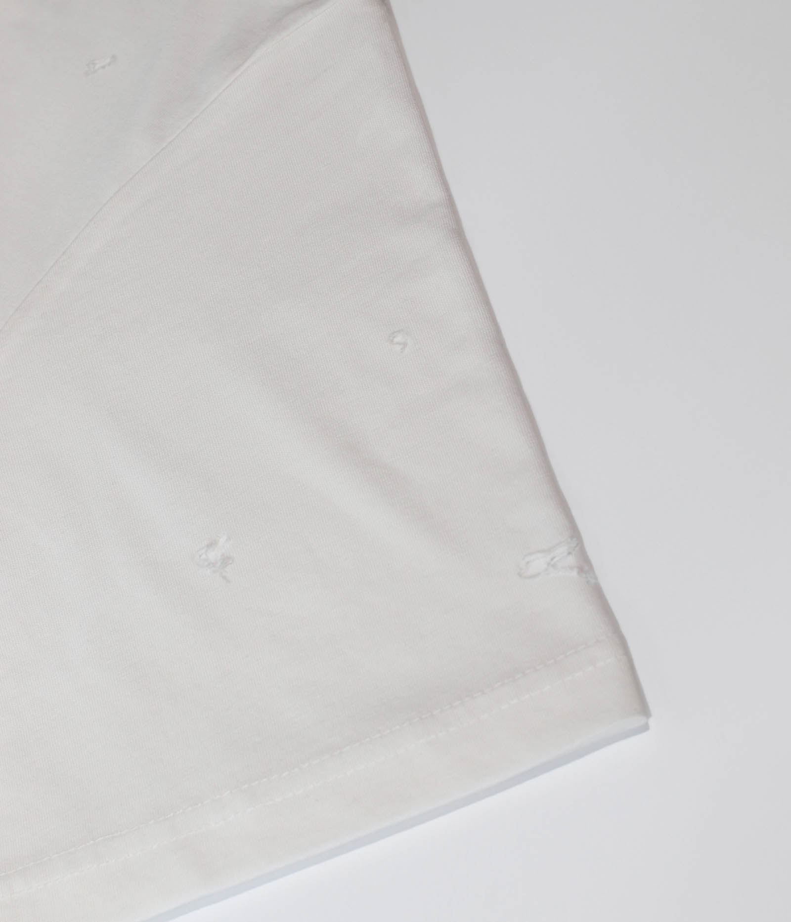 OFF WHITE T-SHIRT CONSTRUCTED USING 100% CERTIFIED ORGANIC COTTON, WITH SCREEN PRINT ON THE FRONT. DROP SHOULDER SILHOUETTE WITH A ROUNDED NECKLINE AND OVERALL OVERSIZED & RELAXED FIT. HAND-APPLIED METALLIC DETAILS AND HANDMADE DESTROYED APPEARANCE.